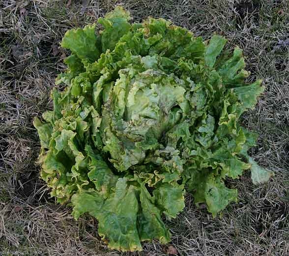 - Symptômes : jaunissement et brunissement du cylindre central (stèle) au niveau du pivot, puis rougissement de ces tissus ainsi que de ceux du cortex des racines (figure 1). Des craquelure sont parfois visibles sur le cortex (similitude avec la maladie du gros pivot non parasitaire chez la laitue) (figure 2). Secondairement, croissance réduite des plantes, jaunissement de la périphérie du limbe des feuilles basses qui flétrissent aussi et se nécrosent progressivement (figure 3 et 4).