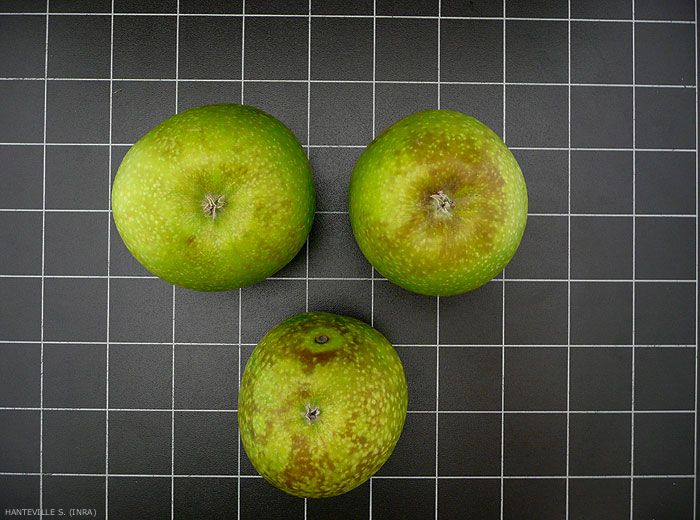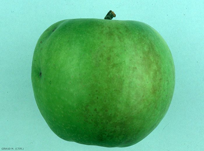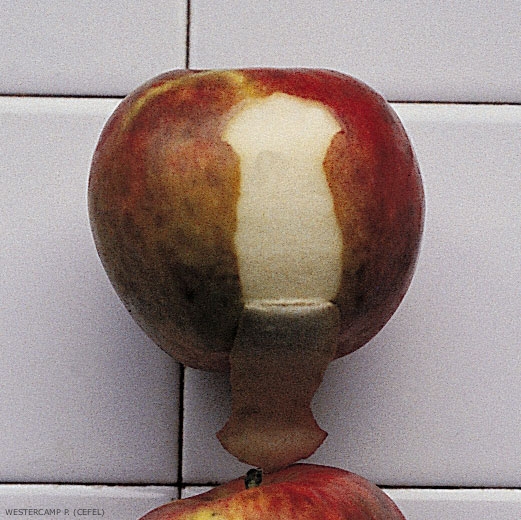 Brunissement superficiel, en plages diffuses (figure 1 à 5), plus facilement observable sur les parties peu colorées du fruit et pouvant devenir d’aspect rugueux. La chair sous l’épiderme n’est pas affectée (figure 6). L'apparition des symptômes a lieu en général à partir de décembre en froid normal, février en atmosphère contrôlée; les symptômes s’accentuent après sortie d’entreposage (figures 7 à 9) à température ambiante.