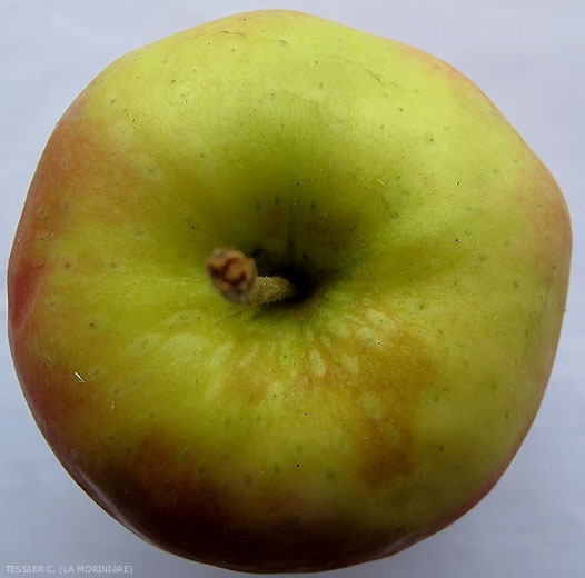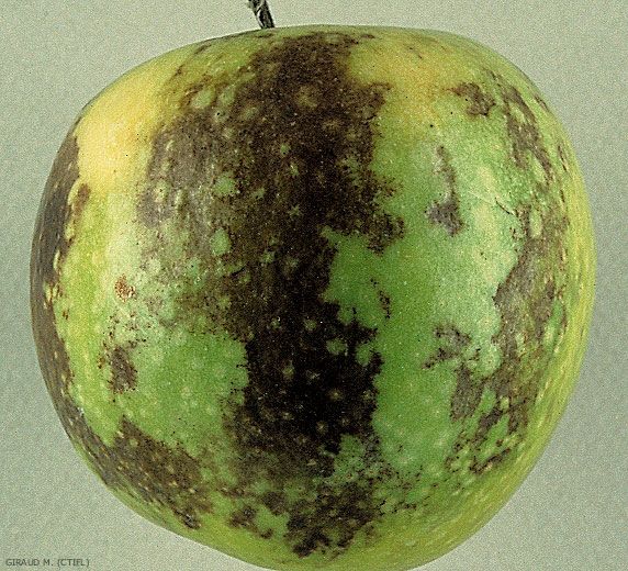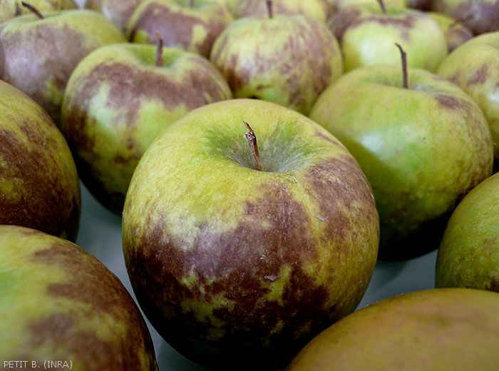 Avec l’échaudure solaire, mais celle-ci est normalement limitée à la face ensoleillée du fruit ;