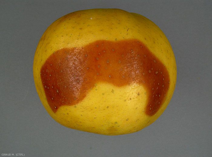 En surface on observe une tache brune à contour net et dont la forme va de l'ovale à la lanière dans le sens équatorial du fruit (figures 1 à 3). En profondeur, les tissus sont bruns et mous jusqu’à 1 à 2 cm environ (figures 4 et 5). Des taches noires dues à Alternaria apparaissent parfois (figures 6 et 7). La maladie peut se propager rapidement en cours de conservation de la mi-novembre à la fin décembre.