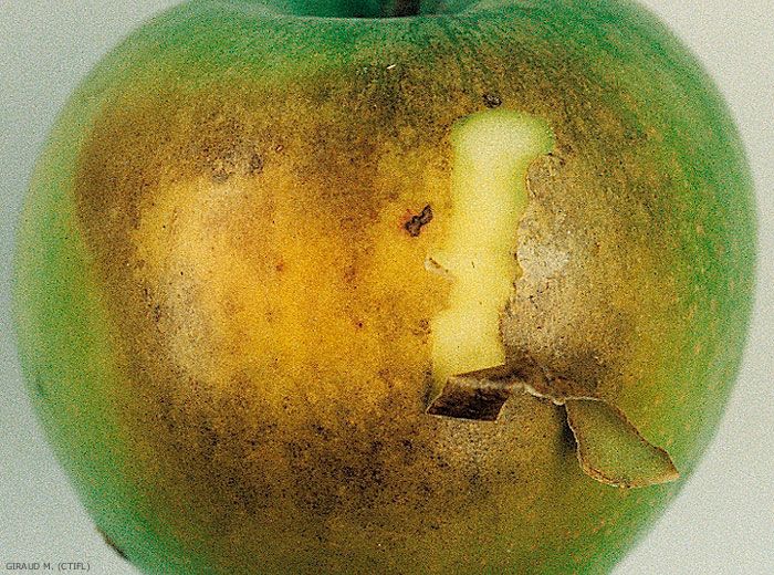 Avec le coup de soleil visible en verger qui peut s’intensifier en conservation sur des fruits non écartés à la récolte.