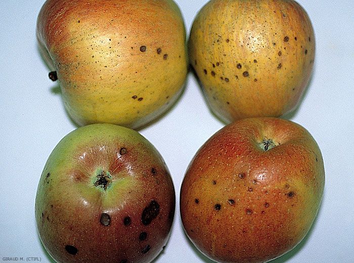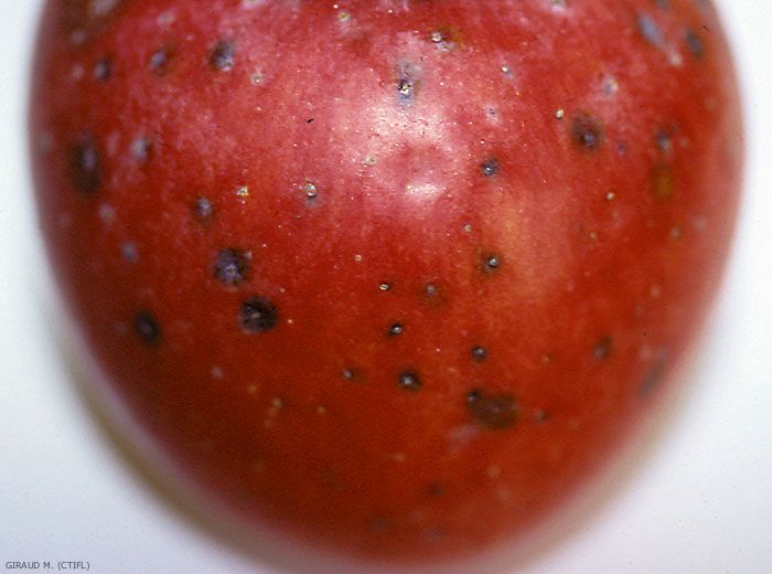 Taches lenticellaires fermes et peu profondes (1 à 2 mm), pouvant confluer en plages plus étendues (figures 1 à 4).