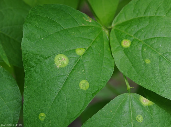 - Description : anneaux chlorotiques ou nécrotiques alternant avec des anneaux de tissus encore verts ; plutôt observés sur les feuilles, ils affectent parfois parfois aussi d’autres organes, notamment les fruits.