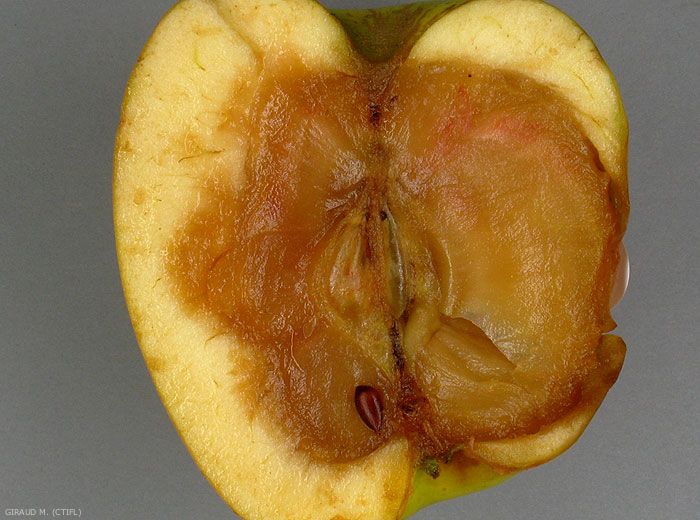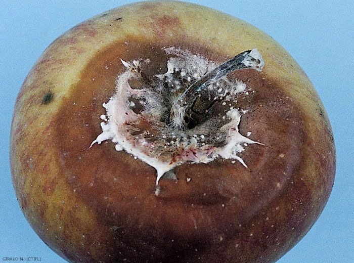 Développement de mycélium blanchâtre à rosé en surface ou dans les cavités internes.