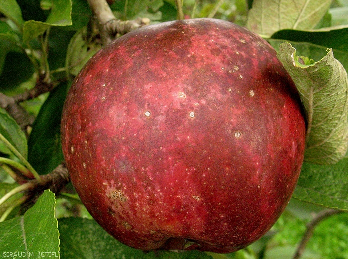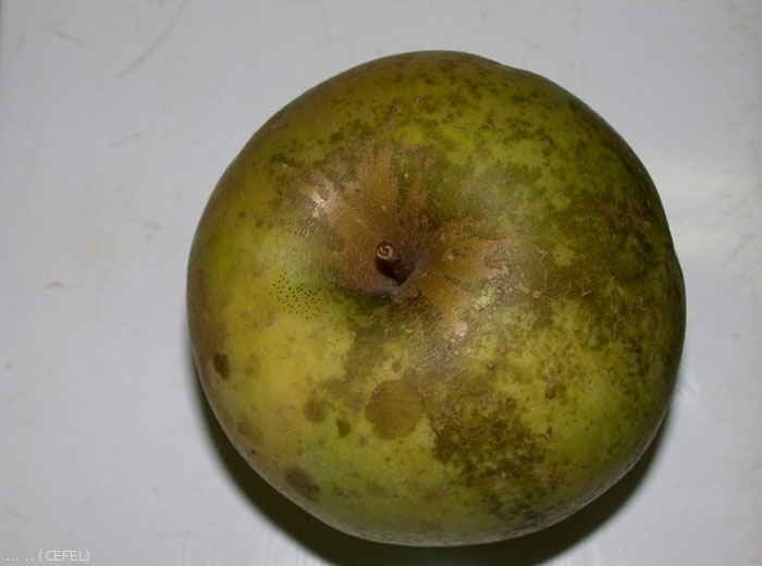 Plages noirâtres de formes variables, à contours diffus, superficielles, n’attaquant que l’épiderme, partant souvent de la cuvette pédonculaire (figures 1 et 2).
