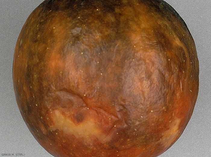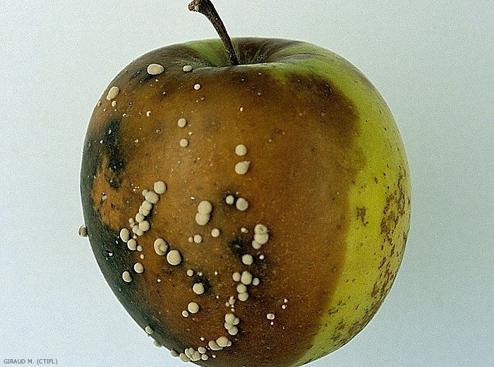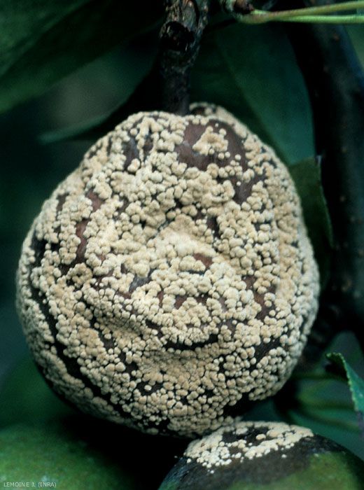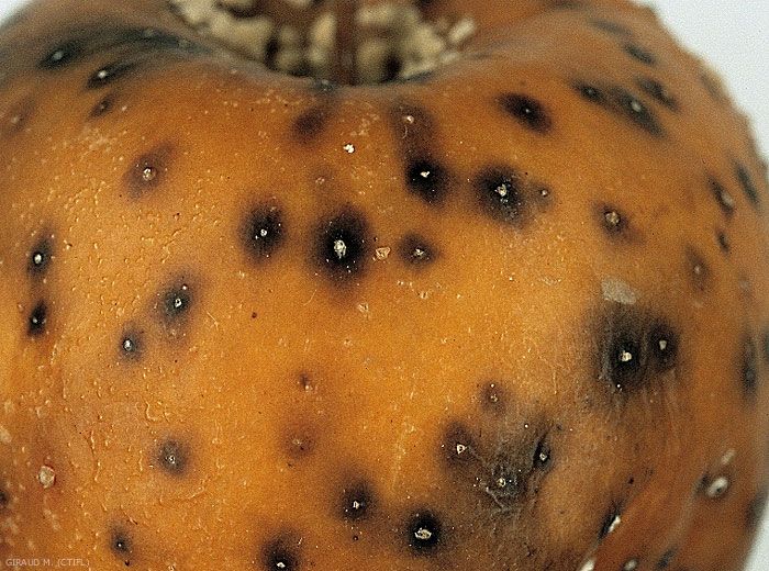 En conservation, l’apparition des symptômes est rapide après la récolte. La pourriture est ferme, marron foncé, à contour régulier (figure 2). Le fruit complètement nécrosé prend une couleur noire (figure 3). Si l’atmosphère est sèche, les coussinets n’apparaissent pas et le fruit reste ferme, de couleur brun foncé avec les lenticelles auréolées de noir (figure 4). Si l’atmosphère est humide, des coussinets blancs puis gris se développent, non concentriques en absence de lumière (figure 5). Le champignon peut aussi contaminer des fruits sains par simple contact et former des nids de pourriture (figure 6).