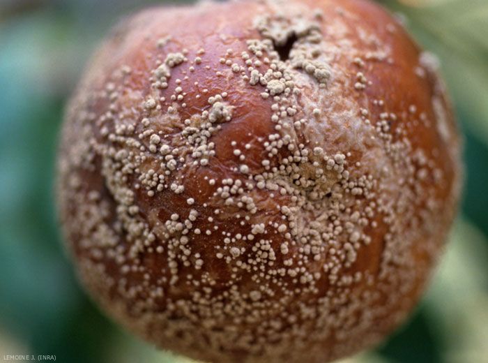 En verger, ils apparaissent pendant l'été et l'automne avant la récolte sur les fruits à la faveur de blessures diverses (morsures de tordeuses, de forficules, de guêpes, dégâts de carpocapse, coups de bec d'oiseaux,...) : ce sont des pourritures fermes, brunes plus ou moins foncées, formant lorsque les conditions sont favorables (humidité) des coussinets conidifères bruns en cercles concentriques (figure 1).