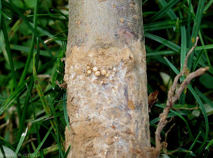 NB : Il n’y a pas de risque de confusion avec l’Armillaire où le mycélium est sous cortical, ni avec le Phytophthora, où il n’y a pas de mycélium blanc mais une nécrose noire.