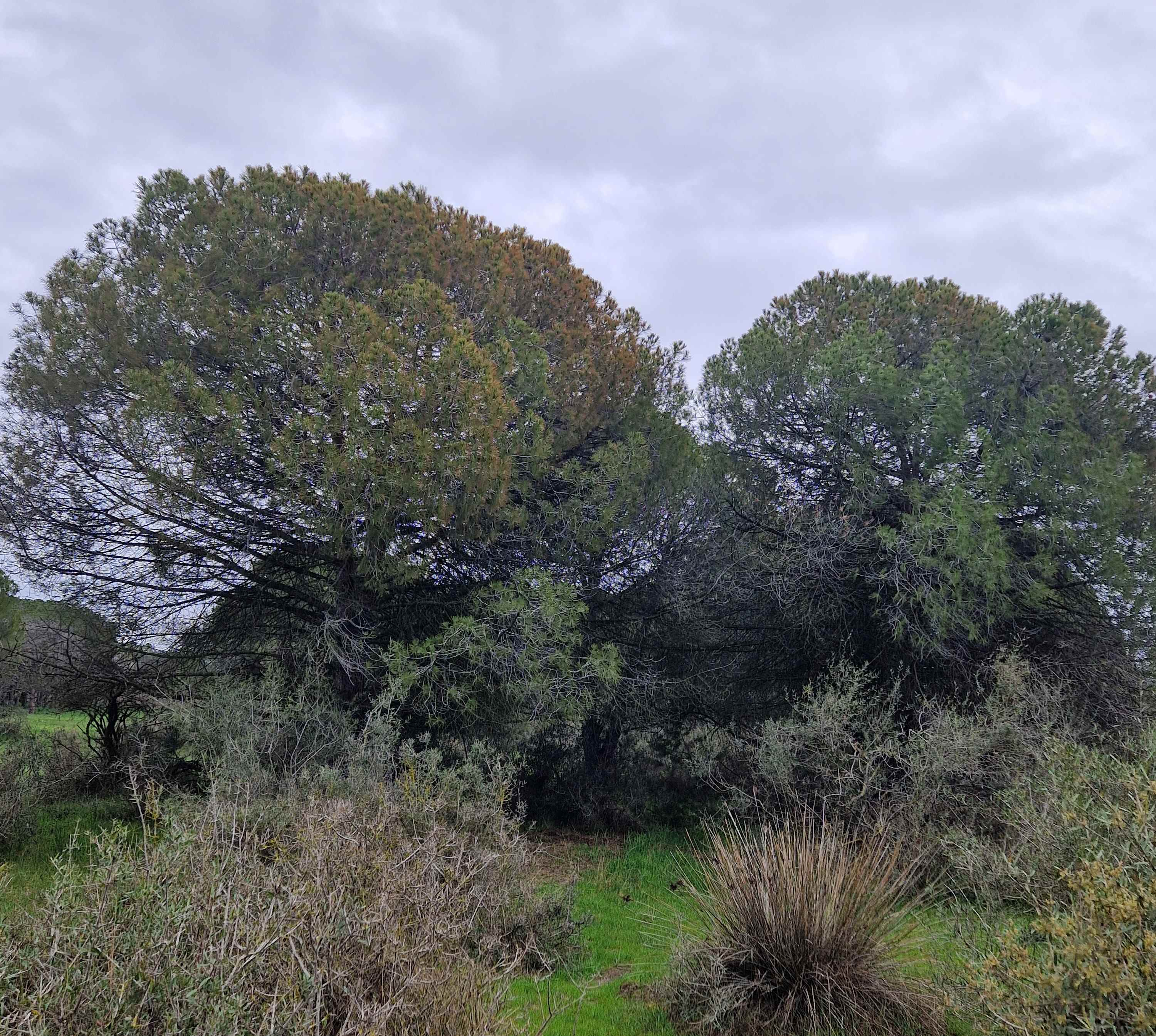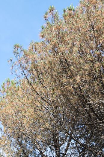 Les cimes des arbres attaqués deviennent clairsemées et présentent des aiguilles avec une coloration anormale. Le feuillage vert est alors situé dans le tiers supérieur de la cime : ce symptôme est remarquable chez Pinus pinea.