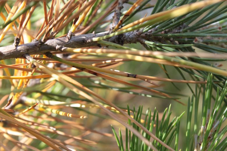 - en situation d'épidémie, les aiguilles de 1 an ou 2 ans (selon les espèces de pins) tombent au printemps.