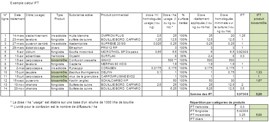 Le tableau (cf. Figure 1) présente un exemple fictif de calcul d’IFT sur le pommier. Il met l’accent sur l’obtention de situations assez différentes de l’IFT pour illustrer différentes sources de variations. Il illustre aussi le regroupement des IFT selon différentes catégories. Les doses/ha des spécialités commerciales sont calculées sur la base d’une application avec un volume de bouillie de 1 000 l/ha pour les produits homologués en litres ou kg/hl [Source e-phy consultée le 06/06/2014].