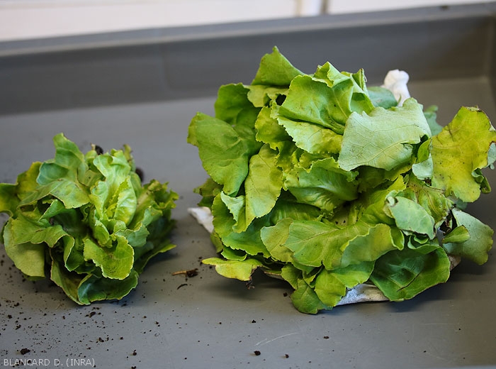 - Jaunissement et se nécrose en périphérie du limbe des feuilles situées sur un côté des salades ;