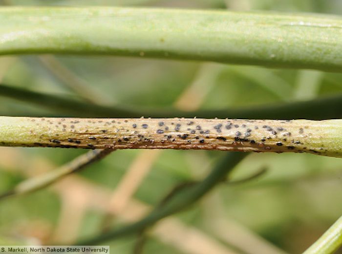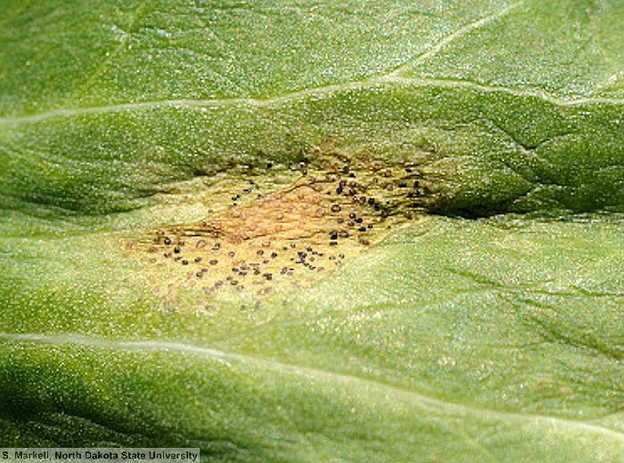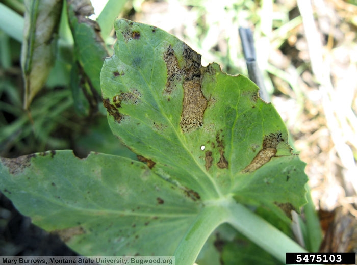 Taches irrégulières brunes cernées de halo jaune clair qui prend ensuite une couleur sombre. Au centre des taches, apparaissent de nombreuses ponctuations noires (pycnides). Ces symptômes apparaissent d’abord sur les feuilles du bas puis si les conditions sont favorables se propagent aux feuilles, tiges et gousses.