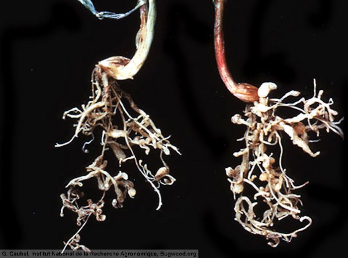 L’observation des racines des plants touchés permet de constater la présence de galles ainsi que des nécroses et des déformations.