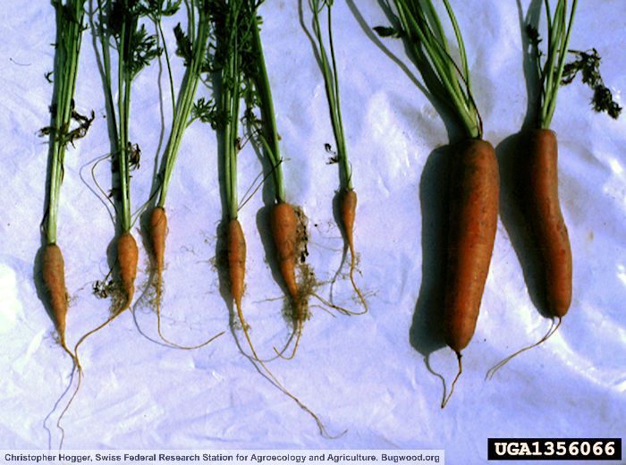 Si des carottes sont cultivées par la suite, les larves vont sortir des kystes et infecter les racines.