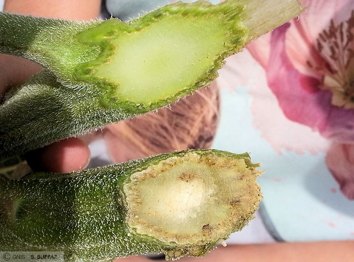 Sur tige : bandes longitudinales noires démarrant de la base et pouvant aller jusqu’au capitule. Présence de microsclérotes noirs (0,05-0,1 mm) sous l’épiderme au niveau de la bande. En fin de cycle, tiges entièrement noires, couvertes de petites stries verticales blanches.