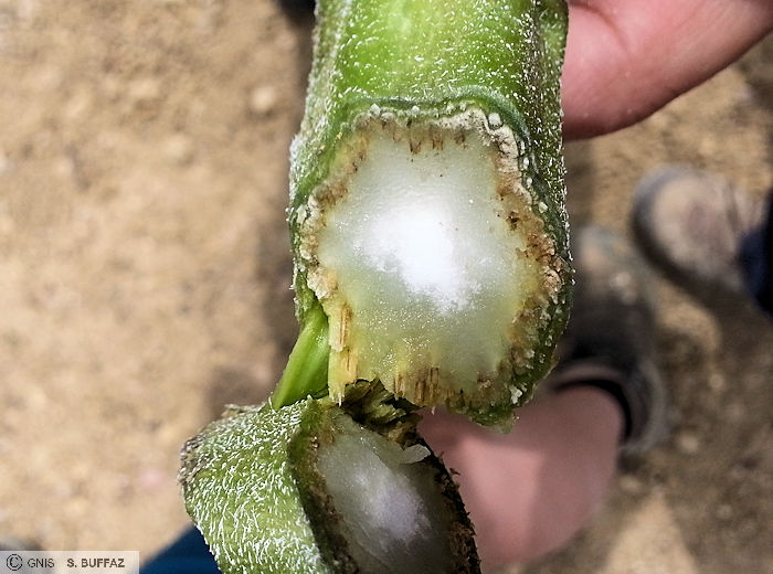Sur capitule : apparition de taches de pourriture molle beige clair au dos du capitule pendant la floraison et en périodes humides, puis développement de mycélium blanc sur sa face fleurie et formation de sclérotes autour des graines.