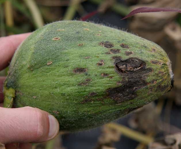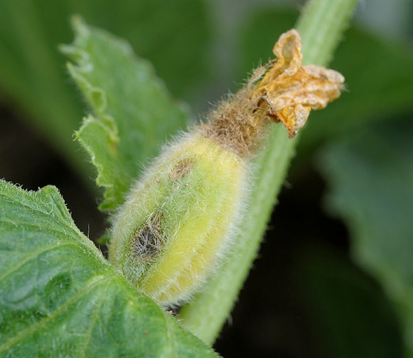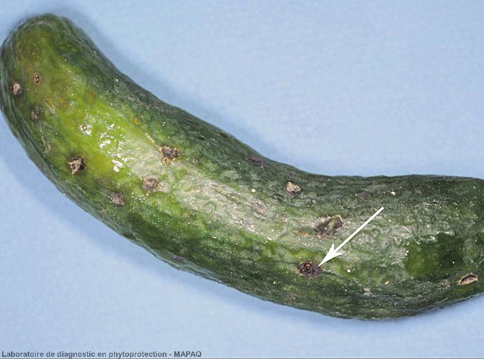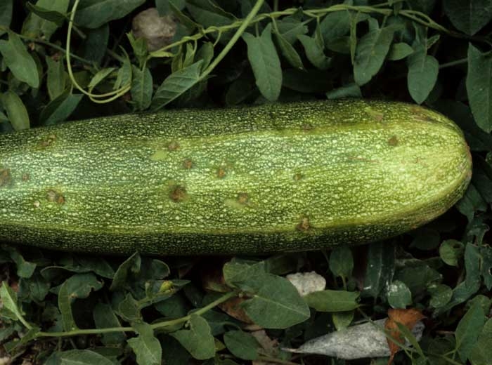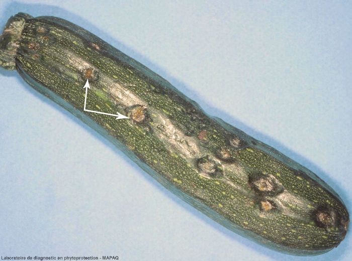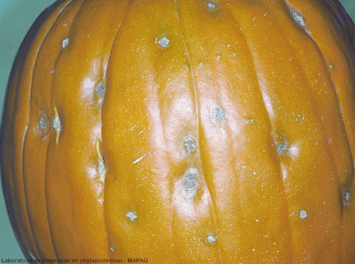 Sur fruits : tâches chancreuses déprimées couvertes d'un duvet olivâtre au centre. Sur melon, formation d’un liège cicatriciel au niveau des taches avec libération d'exsudat gommeux. Sur courges et courgette, déformation des fruits.