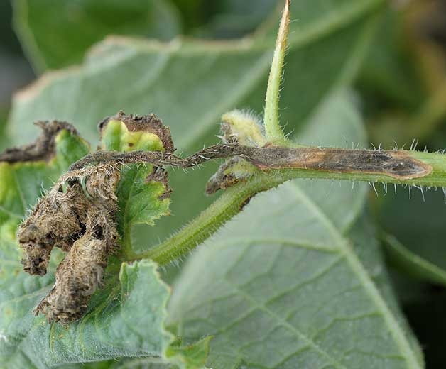 Sur tiges et pétioles : lésions allongées, d’abord humides puis brunes. Sur pétiole de courgette, nombreuses taches graisseuses et nécrotiques.