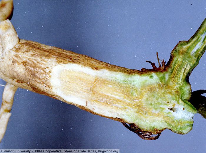 Sur tiges et racines : brunissement du système vasculaire, parfois stries nécrotiques externes sur les tiges près du sol.