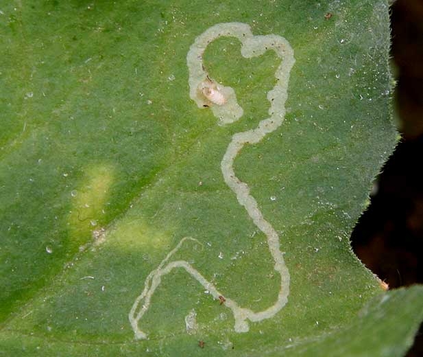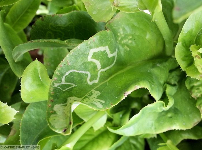 Sur feuilles : présence de petits points blancs correspondant aux piqûres nutritionnelles ou de ponte des adultes, et surtout des galeries sinueuses provoquées par les larves.