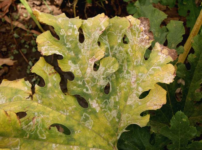 Sur feuilles : présence de petits points blancs correspondant des piqûres nutritionnelles des adultes, et surtout des dégâts de galeries sinueuses provoquées par les larves.