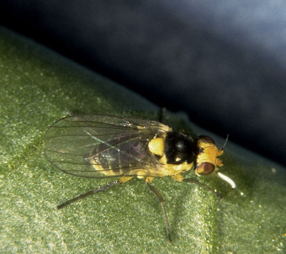 - adulte : petite mouche, de 2 à 2,3 mm pour la femelle et de 1,5 mm pour le mâle, avec une tête jaune et des yeux rouges ; un thorax noir avec des taches jaunes dorsales, abdomen marqué alternativement de bandes jaunes et noires.