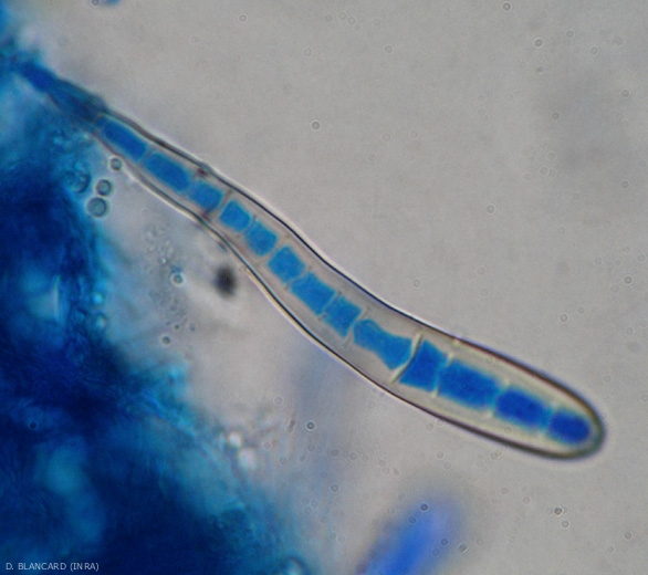 Sporulation : forme de nombreuses spores caractéristiques allongées sur les tissus lésés (figures 1 à 4).
