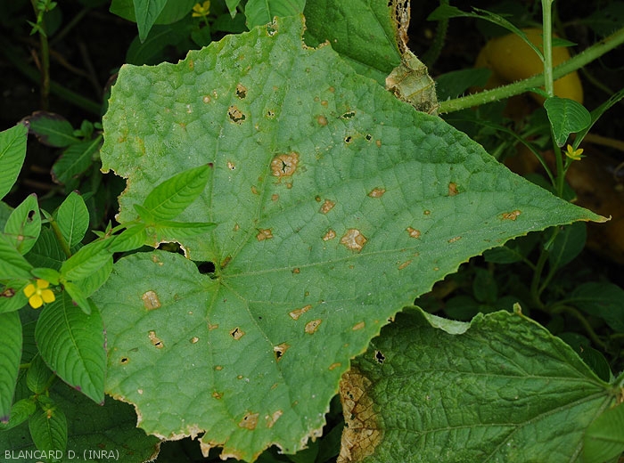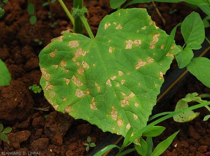 Ces lésions s'étendent et se nécrosent progressivement prenant une teinte beige à brun clair (figures 2 à 10). Le limbe en périphérie des taches est plus ou moins chlorotique (figure 5), et certaines d'entre-elles montrent de discrets motifs concentriques. (figure 10)