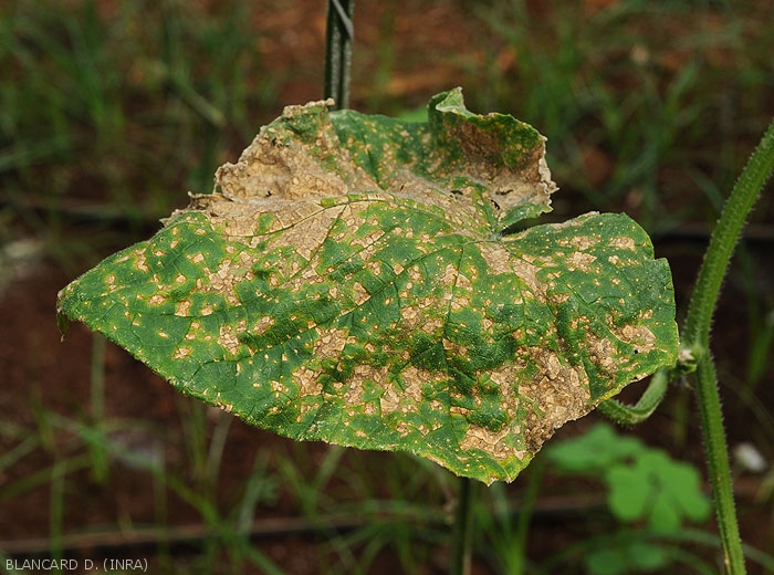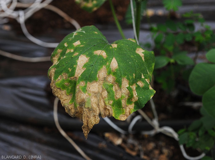 En conditions favorables, les taches confluent et des secteurs entiers du limbe se nécrosent et meurent.