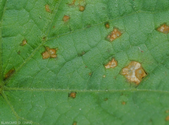 Petites lésions humides délimitées par les nervures, visibles sur les deux faces du limbe (figures 1 à 5).