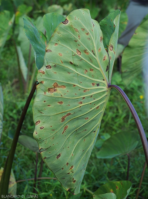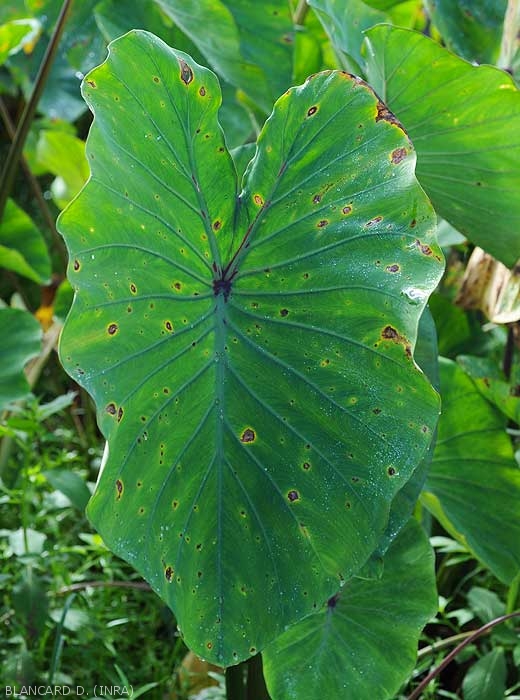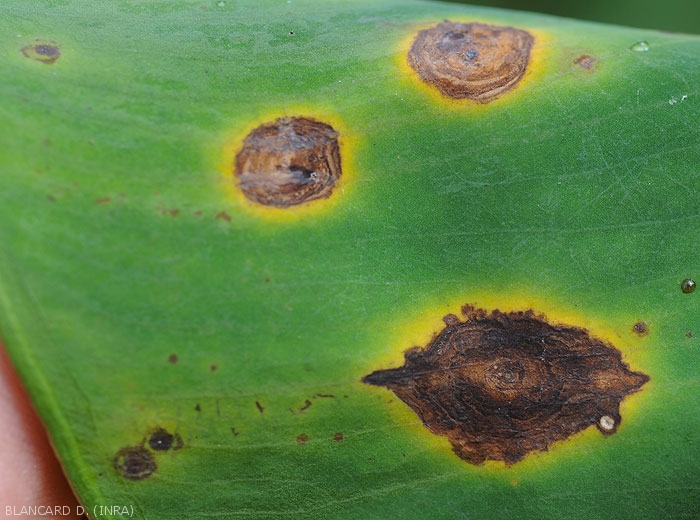 • Taches foliaires circulaires à allongées, brun rougeâtre à noirâtre, se nécrosant progressivement (figures de 2 à 4). Des motifs concentriques sont visibles à l'intérieur, ils rappellent ceux d’une cible (target spots) (figure 5).