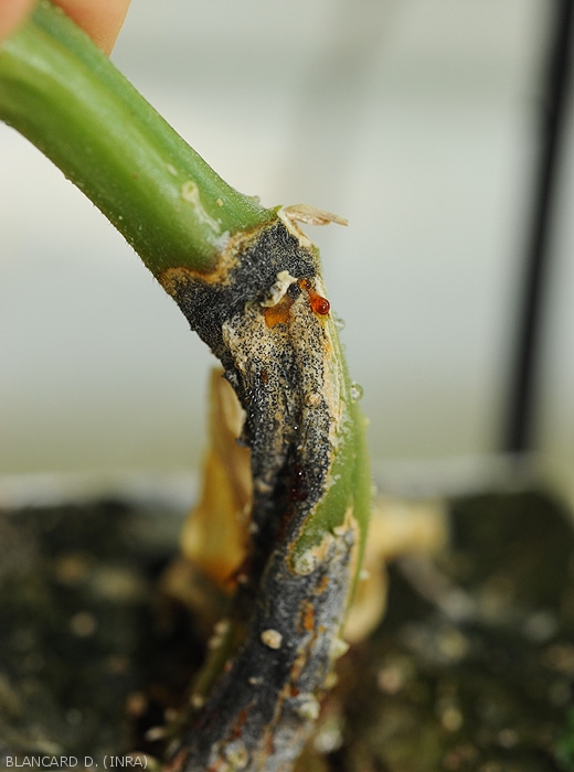 Lésions d'abord humides et vert sombre sur tiges (parties aériennes -figure 4- et collet -figures 5 à 7-), brunissant et se nécrosant progressivement. Des exsudats gommeux brun rougeâtres à noirs sur celles-ci (figures 7 et 8). Ces lésions s'initient bien souvent à partir de plaies de taille, de greffage ou de tissus sénescents présents sur la tige et couvrent des portions importantes de tiges.