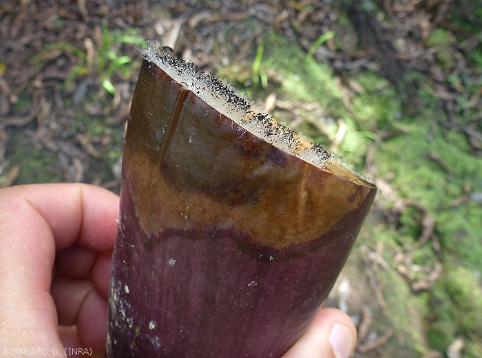 Signes: une moisissure noirâtre et aérienne recouvre plus ou moins les tissus pourris. Des fructifications en forme de minuscules têtes épingle noires sont visibles.