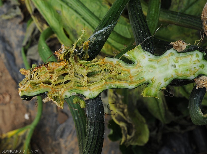 Lésions humides, brunâtres à orangées, envahissant et altérant l'intérieur de la tige, et nombreuses cavités liées à la liquéfaction locales des tissus internes (figure 1).