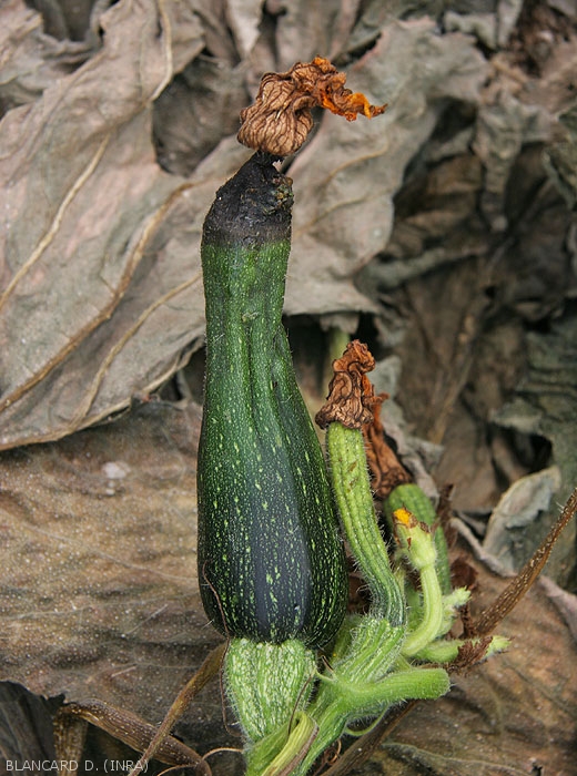 Pourriture humide sur fruits évoluant rapidement. Les tissus humides et mous montrent une teinte brun sombre à noirâtre (figure 5). Elle s'initie préférentiellement à partir de la cicatrice stylaire. Les fruits peuvent se liquéfier totalement (figure 6).