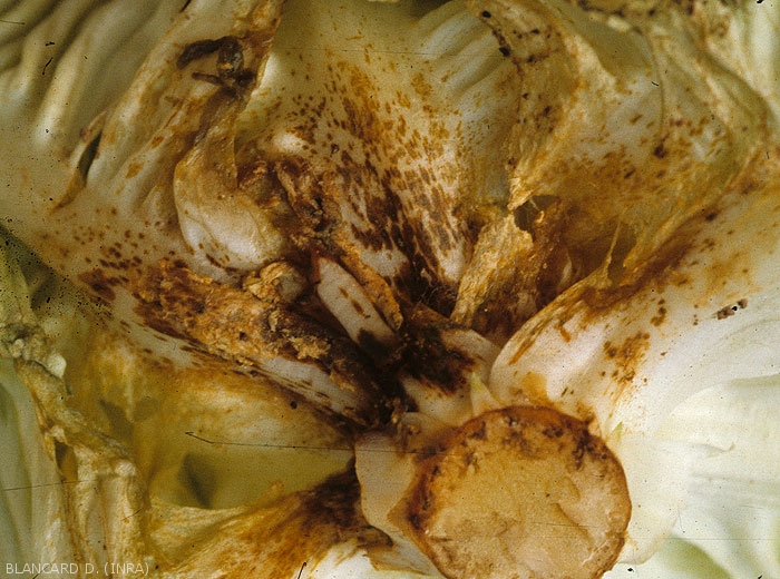 Lésions brunes à noirâtres situées sur le limbe respectant momentanément la nervure principale (figures 3 à 4). Elles s'étendent rapidement et une pourriture plus ou moins humide se met en place (figure 5). Par la suite, elle gagne les feuilles du coeur et parfois même la tige. Le collet peut être ultérieurement ceinturé.