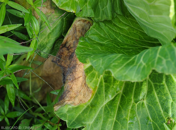 Une pourriture se met en place et gagne l'intérieur du limbe (figure 2). Les tissus brunissent et se nécrosent dans le temps.