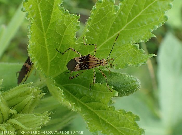 - Punaise parasitant de nombreuses plantes comme le soja, le riz, divers légumes (aubergine, concombre, tomate, poivron, haricot), ainsi que des adventices qui assurent sa multiplication et servent de sources d'infestation.