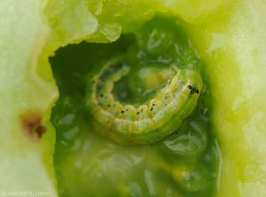 - Perforation des tiges et des fruits qu'elles envahissent par la suite. En plus des perforations, des galeries et de cavités sont observées. De nombreuses déjections sont visibles à l'intérieur et aussi à l'extérieur. Les fruits parasités par exemple de tomate cessent de grossir, mûrissent prématurément et tombent. Soulignons que ces perforations facilitent la pénétration de nombreux agents de pourritures, comme Choanephora cucurbitacearum, etc.
