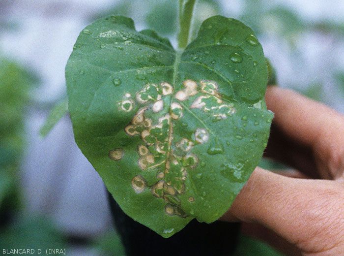** Exemples de symptômes observés : lésions locales (chlorotiques, nécrotiques, etc.), marbrure, mosaïque, jaunissement nervaire, chlorose du limbe, divers motifs, etc.