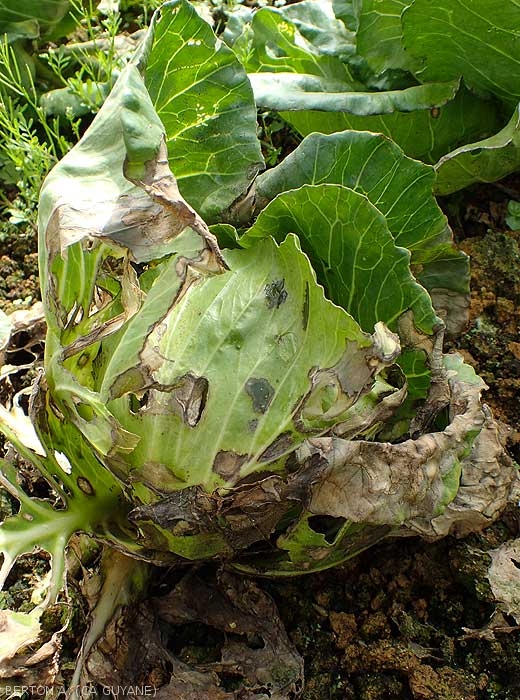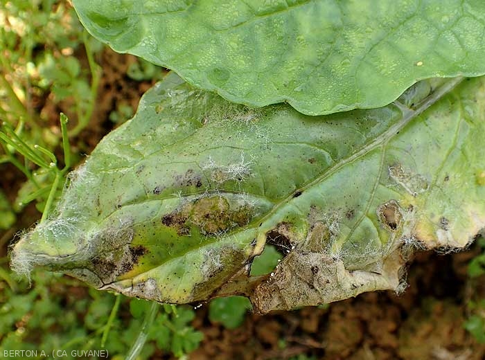En zones tropicales humides, Rhizoctonia solani n'a pas comportement tellurique qu'on lui connait en métropole sur légumes (remplacer par Sclerotium rolfsii), son parasitisme est plus aérien s'attaquant plus volontier à leurs folioles et leurs feuilles (figures 1 et 2). Des souches particulières sont souvent impliquées, reconnaissables par le mycélium et les nombreux sclérotes arrondis quelles produisent sur les lésions , parfois avant même que le champignon ait pénétré dans les tissus (figures 3 à 5).