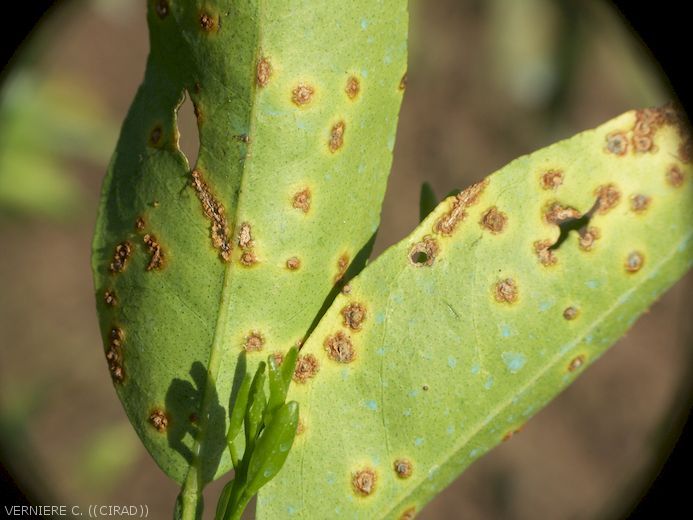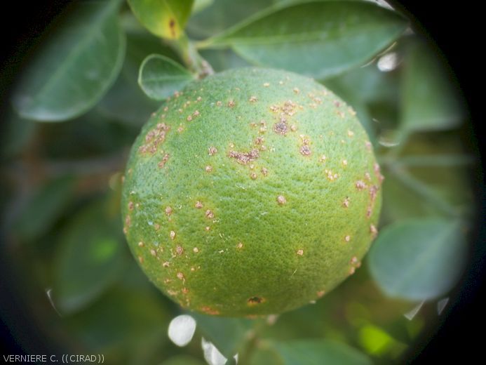 - Fruits : l'aspect général des symptômes est assez semblable à celui décrit sur feuilles. Le halo jaune est plus ou moins marqué selon les espèces d'agrumes infectées. Les symptômes sont en relief par rapport à la surface du fruit et ont un aspect cratériforme. Le chancre ne se développe jamais dans la pulpe du fruit.