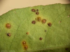 - Puis sur les deux faces des feuilles, les taches prennent un aspect rugueux, craquelé et se colorent en beige bronzé. Leur taille est généralement comprise entre 3 et 5 mm de diamètre, mais celle-ci peut dépasser le centimètre.