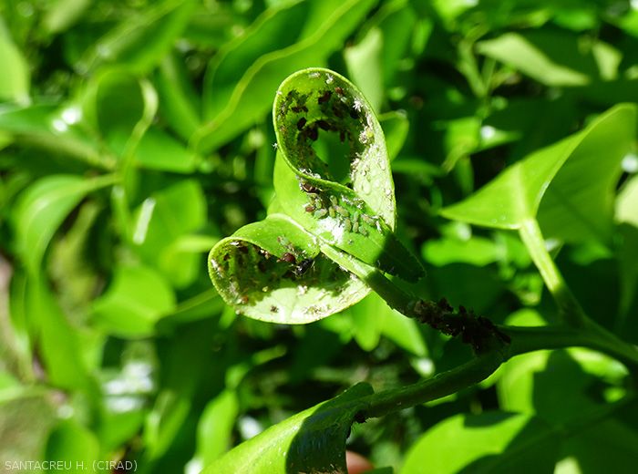 • Miellat sécrété par les pucerons, développement de fumagine sur l'ensemble du feuillage et des fruits, affaiblissement de l’arbre.
