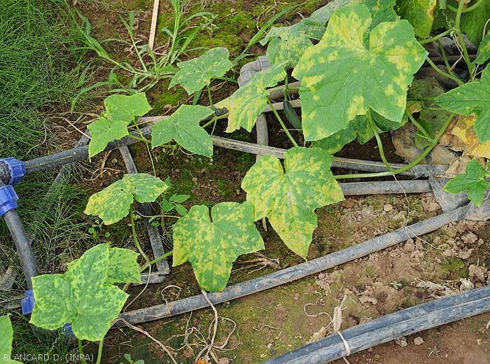 A terme, le limbe présente une mosaïque en taches jaunes et/ou brunes si les lésions sont nécrosées (figures 2 et 6).