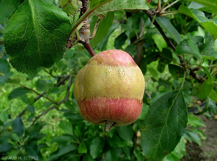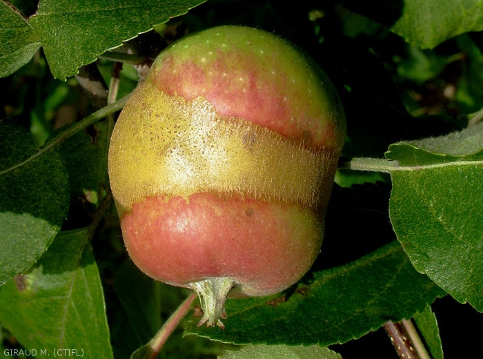 Le symptôme le plus fréquent et le plus spectaculaire est celui de l'anneau de gel (Figures 1 et 2), où la rugosité peut être épaisse mais reste superficielle. Les fruits ne grossissent plus ou peu, sont déformés et chutent prématurément.