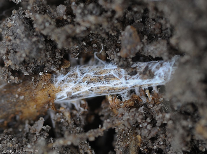 Les signes sont des structures qui matérialisent la présence physique sur ou dans les tissus végétaux, voire les cellules, de microorganismes pathogènes, essentiellement des champignons. Ces structures permettent généralement de les identifier et ainsi de mettre fin plus rapidement au diagnostic. Elles peuvent être discernées à l’œil nu (mycélium -figure 1-, sclérotes -figure 2-, pycnides -figure 3- ou périthèces, sores, etc.) ou nécessiter l’utilisation d’une loupe de terrain, voire d’une loupe binoculaire ou d’un microscope optique (micro-sclérotes, conidiophores, acervules, conidies, inclusions virales, etc.).