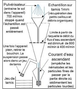 La densité d’un nématode est très légèrement supérieure à celle de l’eau. Lorsqu’un échantillon de sol est placé dans l’eau, les particules lourdes du sol sédimentent plus rapidement que les nématodes. Lors d’une élutriation, un courant d’eau ascendant maintenu constant permet d’empêcher la sédimentation des nématodes. Ceux-ci sont ensuite récupérés en passant le surnageant au travers d’un tamis.