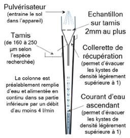 L’extraction des kystes de nématodes est généralement réalisée sur sol humide. L’élutriateur de Kort fonctionne sur le même principe que celui d’Oostenbrinck pour extraire les formes libres, mais possède, en plus, une gouttière inclinée permettant la récupération des éléments de densités inférieures à 1 (débris organiques et kystes) qui flottent. Ils sont évacués par débordement dans cette collerette de récupération en dessous de laquelle se trouve un tamis.